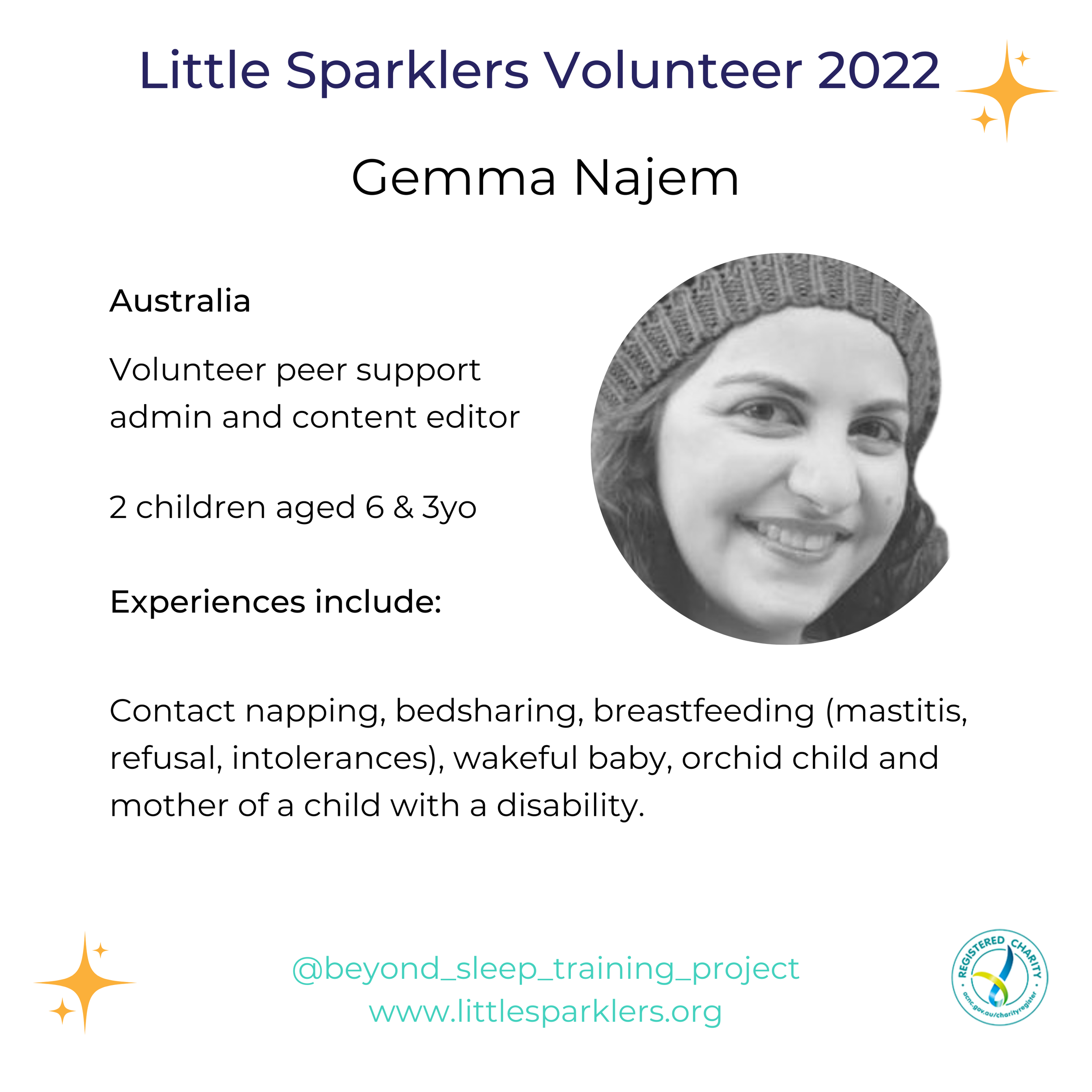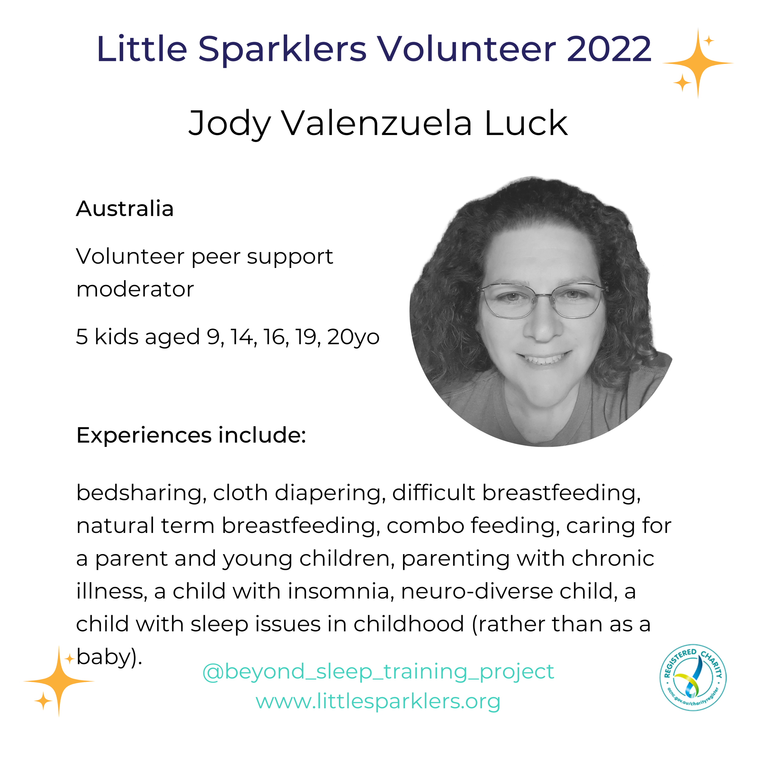 Our peer support group The Beyond Sleep Training Project is 100% volunteer-run and anyone who has had the luck of being on the receiving end of the support given by one of our team will attest, they are some of the kindest, most compassionate and intelligent people you will ever meet. They give their time and wisdom so generously to our members and each brings their own unique lived experience to the fore.
